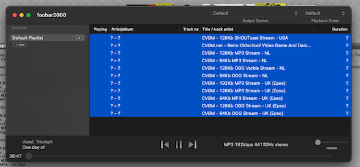 If you are using Winamp or foobar2000, you can just choose Open Location and paste the link to the m3u ( https://radio.cvgm.net/static/media/misc/cvgm_streams.m3u ) and they should all import like the following: